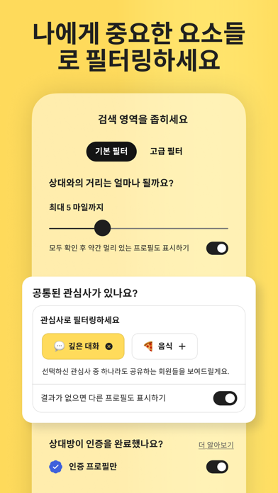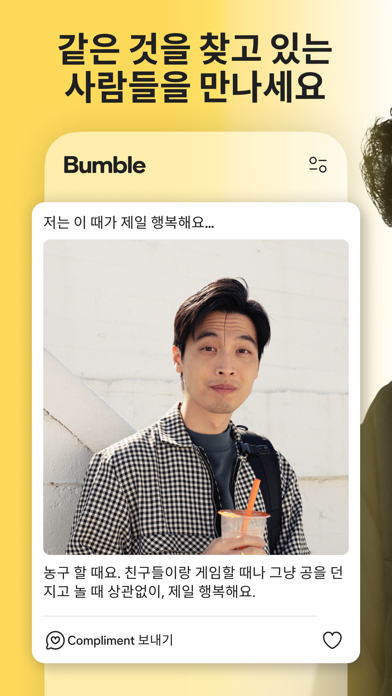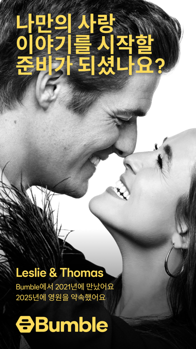 사람들이 진정한 사랑을 찾는 데에 한 걸음 더 가까워지도록 돕는 데이팅 앱 Bumble 데이팅 앱은 사람들이 만나고, 인연을 쌓고, 사랑 이야기를 시작할 수 있는 공간입니다. 저희는 의미있는 관계가 행복하고 건강한 삶을 만드는 초석이라고 믿습니다. 그래서 저희는 멤버들의 안전에 대한 약속과 자신감있는 데이트를 장려하는 도구들을 활용하여 여러분께서도 여러분의 인연을 찾는 데에 도움을 드리고 있습니다. 맞는 사람들과 짝이 되고, 데이트를 하고, 의미있는 인연을 찾으세요 Bumble은 싱글인 사람들을 만나서 상호간의 존중과 신뢰를 바탕으로 인연을 쌓는 목적의 무료 앱입니다. 인생의 단짝을 만날 준비가 되셨거나, 즐거운 시간을 보내기 위해 데이트를 찾고 계신 경우에 상관없이, Bumble은 진솔한 사람들과 의미있는 인연을 쌓는 것을 도와드립니다. 사랑의 챔피언으로서, 저희는 당사 회원들이 존중받고, 자신있고, 인연을 만드는 것을 장려하는 공간을 만드는 것을 우선시합니다. - 저희 멤버들은 저희가 하는 모든 일의 가장 중심에 있습니다 - 저희는 안전을 가장 첫번째 과제로 여깁니다. 따라서 회원님께서 인증을 받은 짝들과 연결되고 있으므로 걱정없이 데이트하실 수 있습니다 - 존중, 용기, 그리고 즐거움이 저희를 가이드합니다. 이를 통해 다른 사람들도 영감을 얻도록 합니다 무료 기능들을 사용해보세요. 데이팅을 보다 쉽게 하기위해 디자인되었습니다. 보다 나은 연결, 대화, 그리고 데이트를 위해 회원님의 프로필을 관심사와 문답들로 회원님에게 맞춤화하세요. 회원님이 어떤 사람인지, 어떤 것들을 좋아하는지, 그리고 무엇을 찾고 있는지 보여줄 수 있어요 신분증 인증을 통해 대화하는 사람이 진짜 사람이라는 것을 믿을 수 있어요 회원님께서 성공적으로 인연을 만드는 데에 도움을 드리기 위해 고안된 전문가가 뒷받침하는 데이트 조언과 함께 자신감을 얻으세요 Spotify 계정을 연결해서 친해질 수 있는 주제로 어떤 음악을 좋아하는지 보여주세요 짝과 영상 통화 및 사진을 공유하면서 서로를 보다 잘 알아가세요 새로운 사람들과 대화할 때 걱정없이 대화하세요. 모든 메시지들은 당사 커뮤니티 가이드라인을 준수해야합니다. 새로운 사람을 만나러 갈 때 믿을 수 있는 사람들과 자세한 정보를 공유해서 추가 안전을 확보하세요 데이트로부터 휴식을 취하고 싶을 때, 스누즈 모드로 프로필을 숨기세요 (짝들은 모두 유지됩니다) 사람들과 연결될 수 있는 더 많은 방법을 원하세요? Bumble Premium으로 데이팅 경험을 업그레이드하는 추가 기능들을 잠금해제할 수 있어요 - 나를 찜한 모든 사람들을 확인해보세요 - "어떤 것을 찾고 계신가요?"와 같은 고급 필터를 사용해서 나의 가치관, 취미, 그리고 목표를 공유하는 사람들을 만나세요 - 만료된 연결은 다시 짝되기를 사용하면 잠재적으로 훌륭한 데이트가 될 지도 모르는 사람들을 놓치지 않을 수 있어요 - 투명 회원 모드를 사용하면 내가 보여지고 싶은 사람들에게만 보여지고 비공개로 프로필들을 볼 수 있어요 - 짝을 24시간 연장하세요 - 더 많은 사람들을 만나고 싶을 수록 더 많이 스와이프하세요 - 트래블 모드로 전 세계에서 데이트할 수 있어요 - 매주 새로고침되는 무료 SuperSwipes와 Spotlights로 돋보이고 확실히 보여지세요 포용력은 핵심입니다 Bumble에서 저희는 모든 형태의 사랑을 지지하고 포함할 것을 약속합니다. 이성애자, 게이, 레즈비언, 동성애자 등을 넘어선 모든 사랑은 그저 사랑입니다. 저희는 저희 커뮤니티 내 모든 사람들이 안전하고 환영받도록 느끼기를 원합니다. 그러니 정체성에 상관없이 대화하고, 데이트하고, 진정한 사랑을 찾는 공간을 찾고 계신다면, 저희가 정답입니다. --- Bumble은 무료로 다운로드 및 사용이 가능한 데이팅 앱입니다. 저희는 선택 사항인 구독 패키지를 제공하며 (Bumble Boost 및 Bumble Premium) 구독없는 일회성 결제, 다회 사용이 가능한 유료 기능들 (Bumble Spotlight 및 Bumble SuperSwipe) 또한 제공합니다. 여러분의 개인 정보는 당사 개인 정보 정책과 적용가능한 법률에 따라 안전하게 처리됩니다. 당사 개인 정보 정책과 이용 약관을 확인하세요. https://bumble.com/en/privacy https://bumble.com/en/terms Bumble Inc. 는 Bumble, Badoo, 그리고 BumbleBFF, 소셜 네트워크와 무료 다운로드 및 사용이 가능한 데이팅 앱의 모회사입니다.