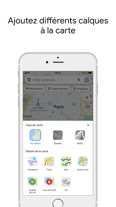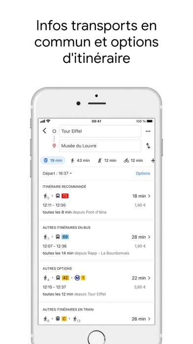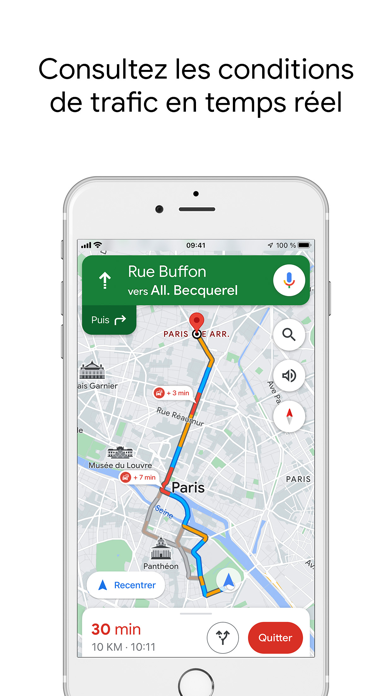 Explorez le monde qui vous entoure rapidement et facilement avec Google Maps. Nous avons cartographié plus de 220 pays et territoires, et répertorié des centaines de millions d'établissements et de lieux sur la carte. Profitez de données en temps réel pour la navigation GPS, le trafic et les transports en commun. Google Maps vous aide également à trouver ce que vous recherchez en vous offrant des informations récentes sur les établissements (y compris les épiceries, les pharmacies et d'autres lieux importants). Effectuez vos trajets de façon efficace : • Identifiez le meilleur itinéraire, qui est recalculé automatiquement en fonction d'informations en direct sur le trafic, les incidents et les routes fermées. Recherchez des établissements importants : • Découvrez les lieux ouverts à proximité et consultez des informations récentes sur leurs horaires d'ouverture. • Recherchez des restaurants locaux proposant un service de livraison ou de vente à emporter. • Créez des listes regroupant vos adresses importantes. Diminuez vos temps de trajet grâce à des informations en temps réel : • Évitez les embouteillages, et vérifiez votre heure d'arrivée prévue et les conditions de circulation en temps réel. • Soyez à l'heure pour prendre votre bus, votre train ou pour partager votre course, grâce aux informations en temps réel sur les transports en commun. • Gagnez du temps grâce aux itinéraires actualisés automatiquement en fonction du trafic, des incidents et des routes fermées. • Le mode Live View de Google Maps vous montre l'itinéraire à suivre à l'aide de flèches et d'indications affichées en superposition sur votre environnement. Vous êtes ainsi certain de savoir où tourner et de ne plus vous tromper de direction. Profitez d'autres avantages dans Google Maps : • Les plans hors connexion vous permettent d'effectuer des recherches et de parcourir la carte sans connexion Internet. • Découvrez des images Street View et des photos de l'intérieur de restaurants, de boutiques, de musées et d'autres lieux. • Les plans d'intérieur vous aident à trouver rapidement votre chemin dans les lieux de grande taille tels que les aéroports, les centres commerciaux et les stades. Certaines fonctionnalités ne sont pas disponibles dans tous les pays. La navigation n'est pas conçue pour les véhicules d'urgence ou de grand gabarit.